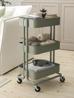 IKEA-nyň iň meşhur we çeýe saklama çözgüdi bolan RÅSKOG arabasy, indi ýakymly çal-ýaşyl reňkde. Bu araba kiçijik giňişliklerde hem ajaýyp orun tapýar. Dört sany ýörediji tigirleri onuň aňsat hereket etmegini üpjün edýär, gulplama funksiýasy bolsa durnuklylygy kepillendirýär. Tor görnüşli tekjeler howanyň aýlanmagyna kömek edýär. Ulanmaly Ýerleri (Universal we Köp Maksatly): Aşhana: Özboluşly reňki bilen aşhananyňyzda goşmaça bezeg we saklama orny dörediň. Wanna otagy: Süpürgiçler, efir ýaglary we gigiena serişdeleri. Iş otagy/Ofis: Ofis esbaplaryny we kagyzlary tertiplemek. Ösümlikler: Kiçijik otag ösümliklerini ýa-da sadaw esbaplaryny goýmak üçin ajaýyp ""gullukçy"". Reňki: Çal-Ýaşyl Materialy: Polat , Epoksi poroşok örtügi. Ölçegleri: Uzynlygy: 35 sm, Ini: 45 sm, Boýy: 77 sm. Maks. Agram (Jemi): 18 kg.