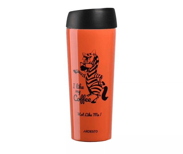 Ardesto AR2645DTO 450 ml Coffee Time (Zebra) termal kružkasydyr. Aýratynlyklary: Wakuum temperaturasyny saklamak tehnologiýasy: gyzgyn içgiler üçin 8 sagada çenli we sowuk içgiler üçin 12 sagada çenli; Metall daşky bölegi mat teksturaly bej reňke boýalan we şahasynda ýalta şekili bar; Içki bölegi 18/10 polatdan ýasalýar; Taýgalmaýan esas agdarylmagyň öňüni alýar; Plastik gapagynda silikon möhür we içmek üçin düwmä basylýan deşik bar. Ölçegleri: beýikligi - 21,5 sm, diametri - 6,7 sm. Gelip çykan ýurdy: Hytaý.
