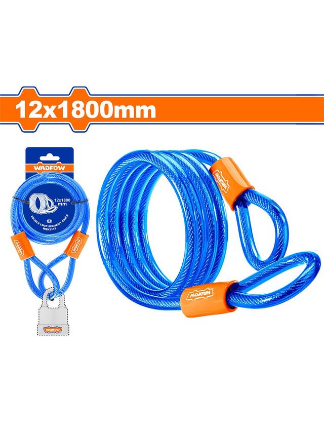 Goşa halkaly howpsuzlyk trossy Uzunlygy: 1800 mm Diametri: 12 mm PWH örtükli örülen tros Ýokary hilli tros Uçlary goşa halkaly Ideal niýetlenilen: welosipedler, derwezeler, motosikller we ş.m. üçin Kagyz kartda gaplanan