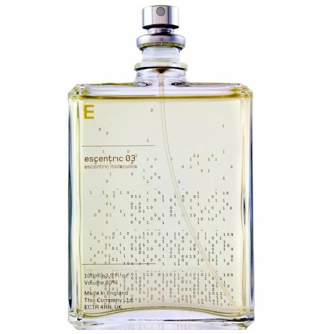 Escentric Molecules Escentric 03 (100 ml) taharet suwy — bu 2010-njy ýylda çykarylan uniseks (erkekler we zenanlar üçin) atyrdyr. Ol agaçly ysmaly / şipr (Woody Spicy / Chypre) toparyna degişlidir. Bu atyryň esasynda Wetiweril Asetat (Vetiveryl Acetate) atly molekula ýatýar. Bu molekula wetiwer ýagynyň arassalanan görnüşi bolup, has arassa, ýumşak we birneme süýji agaç ysyny berýär, adaty wetiwere mahsus agyr, tüsse yslary ýok edýär. Ýokarky notlar Laým, Ymbyr, Gülgün burç Ýiti, ysmaly-sitrusly başlangyç, atyra derrew energiýa we täzelik berýär. Orta notlar Wetiweril Asetat, Iris, Ýasmin, Çaý Aromatiki ýürek. Wetiweril Asetat molekulasy agdyklyk edip, ýumşak, birneme hozly we örän arassa agaç akkordyny açýar. Esasy notlar Kedr, Sandal, Deri, Musk, Ambra Çuň, agaçly-muskusly esas, bu bolsa kök we agaç ysyna esaslanýan çylşyrymly, ýöne arassa yzy üpjün edýär. Escentric 03 — bu arassa, ysmaly we agaçly-sitrusly şipr häsiýetli atyrdyr. Ol gury, salkyn we örän elegant wetiwer ysy bolup, wetiweri gowy görýän, ýöne onuň has täze, döwrebap we tüssesiz görnüşini isleýänler üçin ideal. Gündizki ulanmak we ýyly howa üçin ajaýyp.