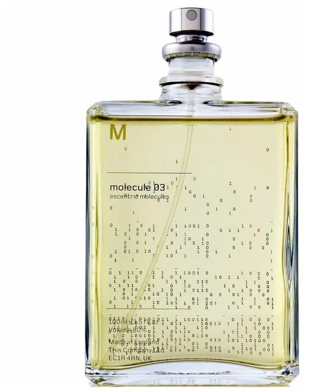 Escentric Molecules Molecule 03 (100 ml) taharet suwy — bu 2010-njy ýylda çykarylan uniseks atyrydyr. Escentric Molecules-iň bütin "Molecule" seriýasynyň özboluşly konsepsiýasy bar: flakon adaty atyr buketisiz, spirtde eredilen ýekeje aromatiki molekulany öz içine alýar. Esasy molekula: Wetiweril Asetat (Vetiveryl Acetate). Bu näme: Bu tebigy wetiwer ýagynyň asetirlenen görnüşi bolan gibrid molekuladyr. Asetilleşdirme prosesi wetiweriň agyr, tüsse we toprak yslaryny aýyrýar, diňe onuň arassa, ýylmanak, agaçly, birneme hozly we süýjümtik esasy galdyrýar. Atyr topary: Agaçly. Molecule 03 atyry adaty manysdaky atyr däl-de, eýsem aromatiki effektidir: Arassalyk we durylyk: Atyr aşa ýeňil we dury bolup, ol gaty sesli "ýaňlanmaýar", eýsem ony dakynýan adamyň derisiniň tebigy ysy bilen birleşýär. Agaçly ýylylyk: Ol arassa, ýumşak wetiwer aurasyny döredýär, ol gury, ýyly, birneme sitrusly we gaty ýakyn agaç akkordy ýaly duýulýar. Duýulmasyzlyk: Molecule 03-i dakynýanlaryň köpüsi, özleriniň ony yzygiderli duýmaýandyklaryny, ýöne töweregindäkilerden öwgü eşidýändiklerini aýdýarlar, bu bolsa ähli molekulýar atyrlara mahsusdyr. Ideal laýyk gelýär: minimalist, inçe, arassa agaç yslaryny halaýanlar we deride aýratyn açylyşyny gymmat saýýanlar üçin.