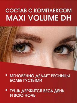 Aýratynlyklary Reňk: BLACK Göwrümi: 12ml Düşündiriş Patentlenen “Maxi Volume DH” toplumynyň we uly çotganyň kömegi bilen tuş derrew her kirpigini örtýär we baý göwrümi we çuň gara reňk berýär. Syýa düzümindäki ýörite polimerler çalt guramagyny we dokumanyň adatdan daşary berkligini üpjün edýän inçe gorag filmini döredýär. Tuşyň gurluşyny ulanmak aňsat we kirpikleriň tutuş uzynlygy boýunça deň paýlanýar. Ulanyş tertibi Iň gowy netijeler üçin kirpikleriň köklerinden başlap, çotgany süpürip, kirpikleriň üstünden ýokaryk hereket edip başlaň. Tuşy guratmaga mümkinçilik beriň. Ikinji ýa-da üçünji gatlagy çalyň.