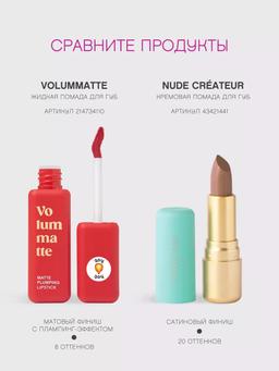Aýratynlyklary Reňk: №08 КРАСНЫЙ Göwrümi: 5ml Düşündiriş VOLUMMATTE, mat gutarýan we klassiki nýuddan baý şeraba çenli sekiz kölegede ýyladyş täsir ediji suwuk pomada. Iň gowy mahmal görnüşini döredýär we dodaklary duýgur, täsirli we görüş taýdan has göwrümli edýär. Yapyşmazdan rahat mat gutarmak üçin gowulandyrylan formula bilen kremli, ýokary pigmentli dokumasy, çalt düzülýär, derini guratmaýar ýa-da berkitmeýär. Pomada perde ýaly dowam edýär, deň derejede ýaýraýar we ilkinji goýmadan baý reňk galdyrýar. VOLUMMATTE pomada gabat gelmek üçin ýumşak duýgur örtükli lakon mat çüýşede gaplanýar. Ýumşak egrilen aplikatoryň kömegi bilen, dodak konturyny galam ulanman jikme-jik boýamak amatly. Ulanyş tertibi Dodaklaryň ortasyndan kontura çenli pomada çalyň. Has uzak dowam edýän makiýaž üçin ilki bilen dodagy maska ýa-da balzam bilen ýumşadyň.