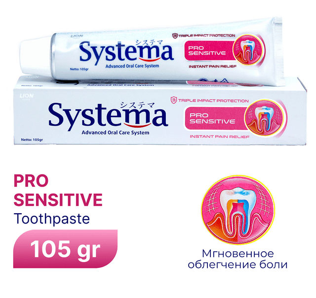 “Systema Pro” duýgur diş pastasy, duýgur dişlere netijeli ideg etmek üçin döredildi. Diş emalynyň duýgurlygyny peseldýän kaliý nitraty we dişleri beketmek we kariesden goramak üçin natriý florid bar.