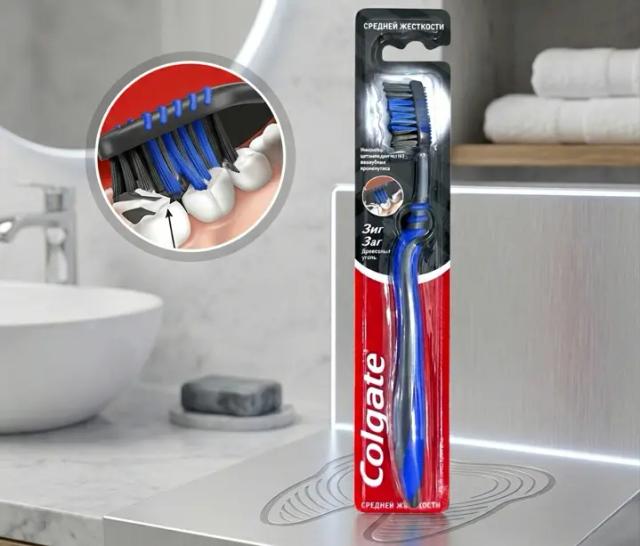 Colgate ZigZag "Agaç kömürli" orta gatylykdaky diş çotgasy agyz boşlugyny her gün arassalamak üçin niýetlenen netijeli serişdedir. Onuň esasy aýratynlygy — zigzag görnüşli atanaklaýyn gylçyklarydyr, olar dişleriň arasyna çuňňur aralaşyp, hatda iň kyn ýerleri hem arassalamaga kömek edýär. Çotganyň gylçyklary agaç kömüri bilen baýlaşdyrylan bolup, ol bakteriýalara garşy göreşýär we demiň terligini saklaýar. Çotganyň kellesiniň arka tarapynda dili arassalaýjy ýumşak düşekçe bar, rezin tutawajy bolsa ulananyňda eliňden taýman, oňaýlylygy üpjün edýär.