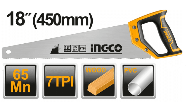 Ножовка по дереву INGCO 450 мм HHAS15450 используется для распиловки деревянных деталей. Благодаря двухкомпонентному материалу, рукоятка удобно располагается в руке. Двойная заточка зубьев гарантирует чистый и качественный рез. Материал пильного полотна: углеродистая сталь марки 65Mn. Назначение: для веток, сучьев, дров Материал режущего полотна: Mn65 Длина режущего полотна: 450 мм Зубья: закаленные TPI (кол-во зубьев на дюйм): 7 Для продольного распила: нет Вес нетто: 0.38 кг