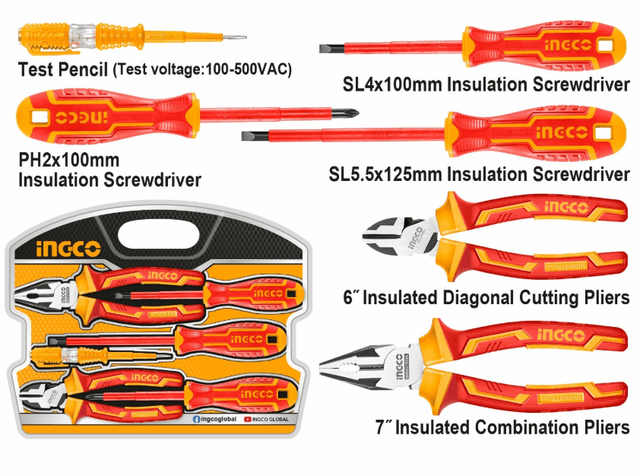 «Набор изолированных ручных инструментов из 6 шт. ВКЛЮЧАТЬ: 1 шт. SL5,5x125 мм отвертка для изоляции 1 шт. SL4.0x100 мм Отвертка для изоляции 1 шт. Отвертка для изоляции PH2x100 мм 1 шт. 7-дюймовые изолированные комбинированные плоскогубцы 1 шт. 6 дюймов изолированные диагональные кусачки 1 шт. тестовый карандаш (испытательное напряжение: 100-500 В переменного тока) Упаковано в двойной блистер».