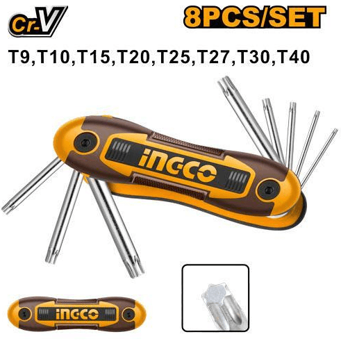 Набор INGCO TORX HHK14083 — компактный и надёжный “карманный” комплект из восьми Torx‑ключей от T9 до T40. Благодаря складывающейся конструкции удобно хранить и пользоваться: инструменты защищены, занимают минимальное пространство и всегда под рукой. Подходит как для бытовых, так и для промышленных задач.