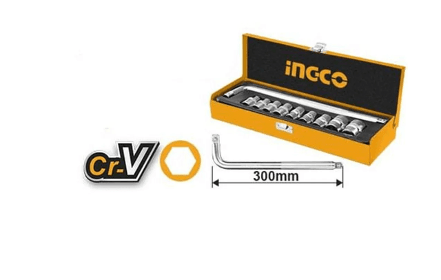 Набор торцевых головок 1/2" 10шт В наборе: Торцевые головки шестигранные 1/2" CRV DR 9шт: 10-12-13-14-17-19-21-22-24мм Удлинительная насадка 1/2" DR 300мм L: 1шт Материал: CR-V (50BV30) Термическая обработка Хромированное покрытие Упаковка: металлический кейс