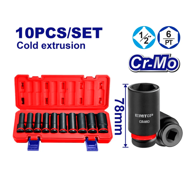 Набор ударных головок EMTOP EMSS12102L – надежность и мощность для профессиональных задач. Набор ударных головок Emtop EMSS12102L создан для работы с ударными гайковертами, обеспечивая высокую эффективность и долговечность. Этот набор станет идеальным выбором для профессионалов, выполняющих сложные монтажные, ремонтные и технические задачи. Набор включает 10 головок различных размеров, что позволяет выполнять широкий спектр работ. Головки изготовлены из специализированной хромомолибденовой стали (CrMo), которая выдерживает высокие нагрузки и обеспечивает долговечность даже в сложных условиях эксплуатации. Головки разработаны специально для работы с ударными гайковертами и другими инструментами, требующими высокой прочности и точности. Поверхность головок имеет устойчивое к коррозии покрытие, которое защищает инструмент и сохраняет его внешний вид даже при интенсивном использовании. Компактный и удобный кейс обеспечивает организованное хранение и транспортировку головок, что особенно важно для профессионального использования. Этот набор станет отличным выбором для автомехаников, инженеров, строителей и других профессионалов, работающих с большими нагрузками и нуждающихся в инструменте, выдерживающем удары и высокое давление. Технические характеристики EMTOP EMSS12102L: Тип крепления: Квадрат с отверстием Количество: 10 шт. Размер посадки: 1/2 дюйма Система измерения: Метрическая Наконечник: Внутренний шестигранник (6 граней) Мин. размер головки: 10 мм Макс. размер головки: 24 мм Ударная: Да Материал: CrMo (Хром-молибден) Тип головки: Глубокая (длинная) Количество граней: 6 Вес нетто: 25.6 кг Упаковка: Кейс