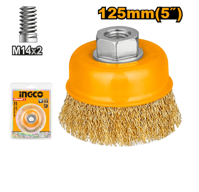 Щетка чашечная INGCO WB11251 используется для работы с УШМ. Служит для зачистки поверхностей покрытых лаком, краской, подходит для устранения ржавчины на металлических изделиях. Щетка оснащена креплением с резьбой М14. Имеет чашеобразную форму корпуса, по краю которого расположена волнистая проволока из латунированной стали, позволяющая оперативно очистить поверхность, затратив минимум времени и усилий.