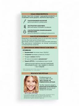 Характеристики Цвет: СВЕТЛО-БЕЖЕВЫЙ Объем: 50ml Описание Легкая текстура создает ощущение комфорта и позволяет коже дышать. Формула обогащена: Гиалуроновой кислотой для интенсивного увлажнения, Экстрактом алоэ вера для смягчения и большего комфорта, Ультратонкими минеральными пигментами для естественного и сияющего результата. Используйте BB cream как тональное средство, увлажняющий крем, защиту SPF20. Доказанная эффективность BB cream: Мгновенно выравнивает тон кожи лица, Устраняет признаки усталости, Придает сияние, 24 часа интенсивного увлажнения, защита SPF20 от ультрафиолетовых лучей. Способ применения Ежедневно наносите BB cream на чистую кожу лица так же, как обычный увлажняющий крем. Для более плотного покрытия нанесите крем повторно. При длительном пребывании на солнце используйте солнцезащитные средства.