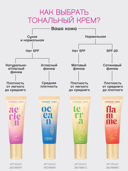 Характеристики Цвет: №01 СЛОНОВАЯ КОСТЬ Объем: 23ml Описание AERIEN — тональный крем от VIVIENNE SABÓ с естественным покрытием. Ультралегкий и воздушный, как утренний ветер в летнем Париже, он сливается с кожей и обеспечивает натуральный безупречный тон. AERIEN ложится на кожу, как нежный бриз, овевающий твое лицо во время прогулки вдоль Елисейских полей, улучшает и выравнивает тон, скрывает несовершенства и создает покрытие от легкого до среднего с натурально-атласным финишем. Полупрозрачная вуаль крема деликатно рассеивает свет и придает сияние. Тональный крем в трех натуральных оттенках упакован в тубу с матовым покрытием и золотистым орнаментом, символизирующим одну из стихий. AERIEN не забивает поры и не вызывает ощущения тяжести на коже. Подобно прогулке по Монмартру, образ с тональным кремом от VIVIENNE SABÓ окутывает аурой элегантности и утонченности. Способ применения Распределите крем легкими похлопывающими движениями кончиками пальцами или кистью для тональных средств от центра лица к контурам.
