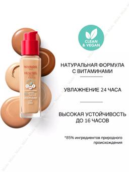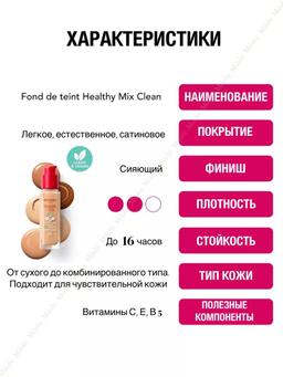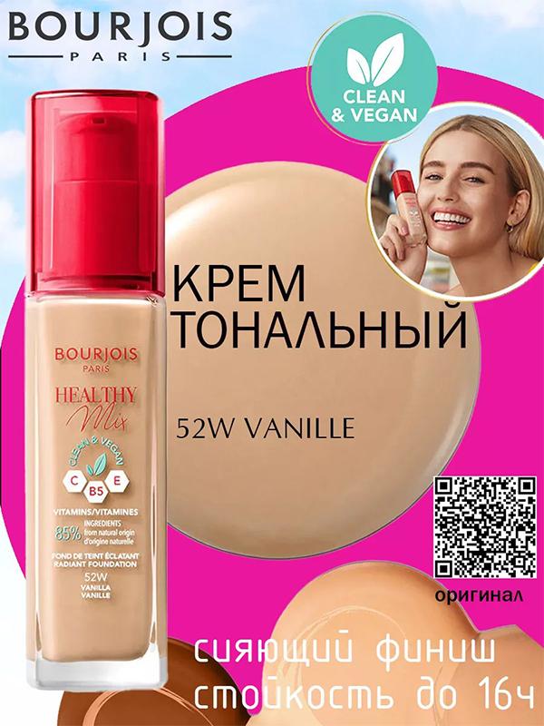 Характеристики Цвет: №52W VANILLA Объем: 30ml Описание Тональный крем Bourjois Healthy Mix Foundation. Мягкая и легкая текстура с витаминно-фруктовым комплексом скрывает недостатки, помогая достичь сияющего и безупречного тона. Тональный крем усиливает естественное сияние кожи и улучшает эластичность, визуально сокращая глубину морщинок. Эффект сияния и увлажнения продлится в течение 8 часов. Способ применения Нанесите небольшое количество средства на увлажненное лицо в направлении от лба к подбородочной линии и распределите пальцами или сухим спонжем.