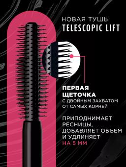 Характеристики Цвет: BLACK Объем: 9.9ml Описание Поднимите свои ресницы на новый уровень с помощью удлиняющей водостойкой туши Telescopic Instant Lift. Щеточка с двойными щетинками для захвата ресничек от самых корней: мгновенно приподнимает, подкручивает и обеспечивает до +5 мм в длине. Осмельтесь на все и сразу: заметное удлинение, приподнятые ресницы и суперстойкий эффект до 36 часов благодаря водойстойкой формуле. Не отпечатывается, не утяжеляет и не размазывается в течение дня. Офтальмологически протестировано. Способ применения Начните наносить тушь с помощью передней стороны двойной щеточки от корней ресниц для придания длины и подкручивания. После этого используйте боковую часть щеточки для разделения ресниц и еще большего объема.