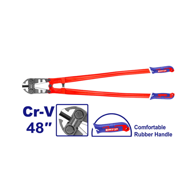 Boltorezi EMTOP EBCR4801 galyň demir çybyklary we zynjyrlar kesmek üçin niýetlenen 1200 mm (48 dýuým) uzynlykda kuwwatly senagat guralydyr. Lezwiýesi ýokary berklikdäki hrom-wanadiý poladyndan (Cr-V) ýasalan, gara reňk bilen işlenen we ýylmanan. Amatly we ygtybarly işlemek üçin gural ynamly tutuşy we ýadawlygy azaldýan termoplastik rezin (TPR) materialdan ýasalan iki reňkli tutawaç bilen enjamlaşdyrylandyr. Tehniki häsiýetnamalary: Model: Boltorez EMTOP EBCR4801 Synp: Senagat Ölçegi: 1200 mm (48 dýuým) Lezwiýe materialy: Cr-V polady Lezwiýäniň işlenilişi: Gara reňk we ýylmanyş Tutawajyň materialy: Iki reňkli TPR (termoplastik rezin)