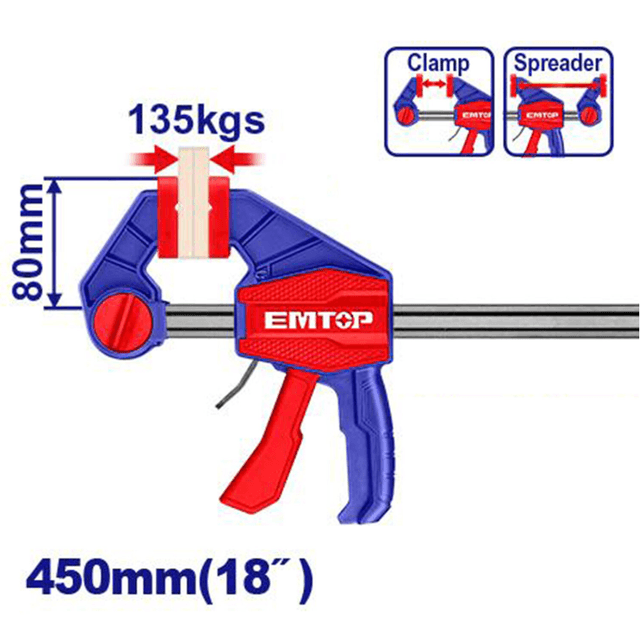 Emtop ECLPQ80181 — ölçegi 80×450 mm bolan çalt gysýan F-görnüşli gysgyçdyr (strubsina). Hromlanan örtükli polatdan ýasalan, maksimal gysyş güýji — 135 kg, ştangasynyň galyňlygy we giňligi 6×18 mm, plastik tutawajy bar, agramy — takmynan 0,9 kg (çaklama), Hytaýda öndürilen.