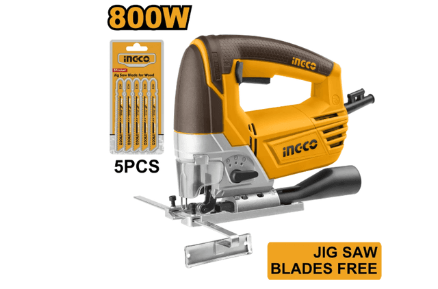 INGCO JS80028 INDUSTRIAL — agaç, polimer we metal materiallary göni we egriçiziikli kesmek üçin niýetlenen elektrikli lobzik. Käbir häsiýetnamalary: Güýji: 800 Wt; Naprýajeniýesi: 220–240 V, 50/60 Gs; Boş durşundaky ýygylygy: 800–3000 aýlaw/min; Agaç üçin maksimal kesiş galyňlygy: 100 mm; Metal üçin maksimal kesiş galyňlygy: 10 mm; Alýumin üçin maksimal kesiş galyňlygy: 12 mm; Byçgynyň gidişi: 23 mm; Podoşwanyň gyşaryş sazlamasy: 0–45°; Aýlawlaryň elektrik sazlamasy: 6 rejim; Alýuminden guýlan podoşwa;