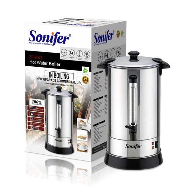 Sonifer SF-2073 elektrik samowary (10 litr) — bu çaý içmek däpleriniň döwrebap görnüşi bolup, uly göwrümi we öňdebaryjy tehnologiýalary özünde jemleýär. Bu enjam uly maşgala dabaralary, ofisler ýa-da myhman söýerlik pudagynda ulanmak üçin ideal amatlydyr. Ýokary hilli poslamaýan polatdan ýasalan samowar suwuň çalt gyzmagyny we ýylylygyň dowamly saklanmagyny üpjün edýär. Enjam saýlanan temperaturany saklaýan termostat funksiýasy bilen enjamlaşdyrylandyr, bu bolsa islendik wagt gyzgyn çaýdan lezzet almaga mümkinçilik berýär. Akdyrmaýan oňaýly krany we gyzmaýan ergonomiki tutawaçlary ulanmakda howpsuzlygy we oňaýlylygy kepillendirýär. Toplumda çaýyň kämil demlenmegi üçin üstünde ýerleşdirilýän stilli keramiki çaýnek bar. Sonifer SF-2073 — bu öýüňizde ýylylyk we ak ýüreklikden myhman söýerlik gurşawyny döredýän esasy merkez bolar.