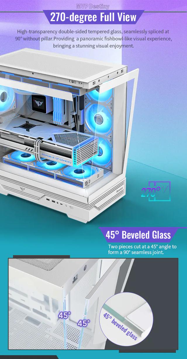 Modeli: MVP Destiny Metal ölçegi: L440 × W235 × H478 mm Korpus ölçegi: L445 × W235 × H490 mm Korpus reňki: Ak Metal materialy: 0.7 mm SPCC Ene plata (M/B): ATX / M-ATX / Mini-ITX Saklaýyş: 3.5" HDD ×1 + 2.5" SSD ×2 Tok üpjünçiligi (PSU): ATX CPU sowadyjy beýikligi (çäklendirme): 168 mm çenli Wideo kartanyň uzynlygy (çäklendirme): 400 mm çenli PCI-E slot: 7 I/O portlary: Type-C ×1 + USB 3.0 ×2 + HD Audio Sistem sowadyjylary: Ýokary bölek: 120 mm ×3 Yzky bölek: 120 mm ×1 Içki bölek: 120 mm ×3 Ene plata tarapy: 120 mm ×3 Gutynyň ölçegi: L566 × W327 × H542 mm Esasy aýratynlyklary: ATX / M-ATX BTF (back to feature) ene platany goldaýar 10 sanyna çenli sistem sowadyjy goldawy Ýokary bölekde 360 mm suwuk radiator goldawy Gapdal paneli we öň paneli aňsat gurnama Type-C porty