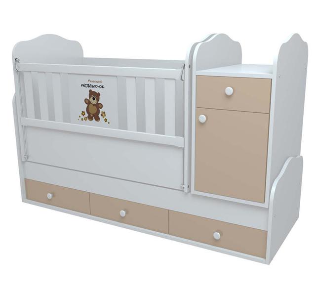 Transformator krowat. Çagalar krowady – komodly we yrgyldadyjy mehanizmly transformatordyr. Krowatyň aşagynda teleskopik ugrukturyjylar bilen 3 sany çekme bar, olar az ýerde çaganyň goşlaryny we oýunjaklaryny amatly ýerleşdirmäge mümkinçilik berýär. Krowaty çaga üçin ýazuw stoluna öwrüp bolýar. Gapdalynda çaganyň arlygyny çalşyrmak üçin ýeri bolan komod ýerleşýär. Konstruksiýanyň ähli elementleri ýokary berklikdäki LDSP-den öndürilen. Çaga aňsat ýetmek üçin gapdal germeji aşak düşürilýär. Keseleýin yrgyldadyjy mehanizmly maýatnik. Ölçegleri (U.x I.x B.) – 173,2 х 66,0 х 110,7 sm Çaga ýatylýan ýeriniň ölçegi – 60 х 120 sm Ýetginjek ýatylýan ýeriniň ölçegi – 60 х 170 sm Tumbanyň ölçegi (I.x B.) – 41,6 х 66,0 sm Agramy - 85 kg. Matras komplekta girmeýär!