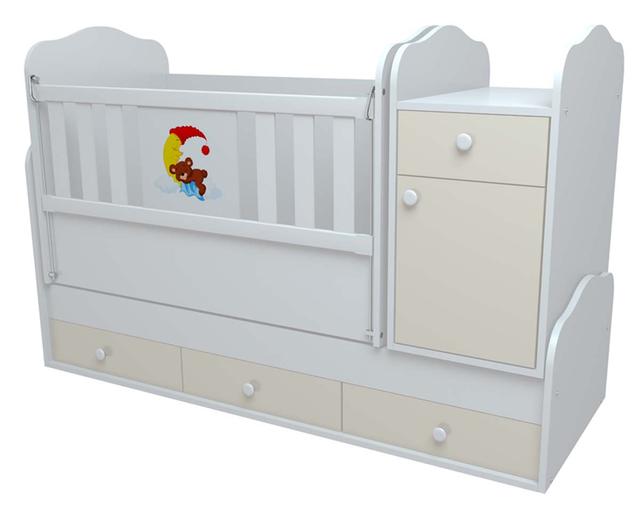 Çagalar krowady – komodly we yrgyldadyjy mehanizmly transformatordyr. Krowatyň aşagynda teleskopik ugrukturyjylar bilen 3 sany çekme bar, olar az ýerde çaganyň goşlaryny we oýunjaklaryny amatly ýerleşdirmäge mümkinçilik berýär. Krowaty çaga üçin ýazuw stoluna öwrüp bolýar. Gapdalynda çaganyň arlygyny çalşyrmak üçin ýeri bolan komod ýerleşýär. Konstruksiýanyň ähli elementleri ýokary berklikdäki LDSP-den öndürilen. Çaga aňsat ýetmek üçin gapdal germeji aşak düşürilýär. (Nagyşsyzy hem bar.) Keseleýin yrgyldadyjy mehanizmly maýatnik. Ölçegleri (U.x I.x B.) – 173,2 х 66,0 х 110,7 sm Çaga ýatylýan ýeriniň ölçegi – 60 х 120 sm Ýetginjek ýatylýan ýeriniň ölçegi – 60 х 170 sm Tumbanyň ölçegi (I.x B.) – 41,6 х 66,0 sm Agramy - 85 kg. Matras komplekta girmeýär!