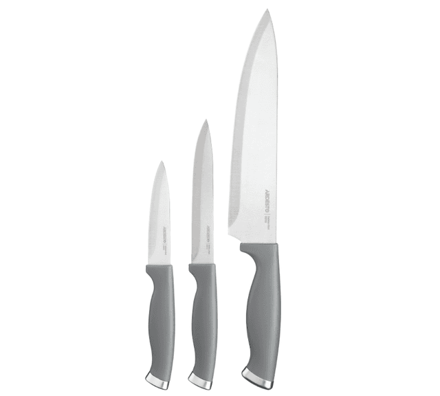 Ardesto Gemini Gourmet AR2103GR üç sany aşhana pyçagynyň toplumydyr: Aşpez pyçagy - pyçagynyň uzynlygy 20.3 sm Iş pyçagy - pyçagynyň uzynlygy 12.7 sm Ösümlik pyçagy - pyçagynyň uzynlygy 8.9 sm Aýratynlyklary: Pyçaklar 3CR13 polatdan ýasalýar. Tutgawlary berk çal plastikden ýasalýar. Pyçaklar gap ýuwýan maşynyň howpsuzlygy üçin maslahat berilmeýär.