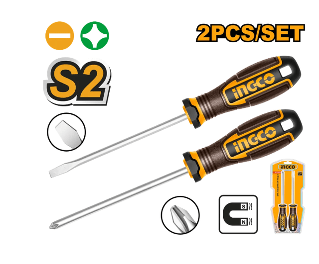 2 sany otwertkalar toplumy Tygynyň materialy: S2 Okunyň (hwostowik) görnüşi: tegelek 1 sany SL6.56125 mm 1 sany PH26125 mm Tutawajynyň materialy: üç reňkli ergonomiki Güýçli magnitli Goşa blisterde gaplanan