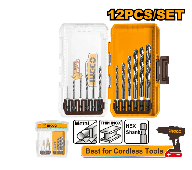 INGCO AKDL11206 INDUSTRIAL — metal üçin spiral burgy toplumy, toplumda 12 sany bar. Esasy häsiýetnamalary: Niýetlenişi: metal bilen işlemek üçin; Materialy: çalt kesiji polat HSS (HSS 4341); Sapjygyň görnüşi: altyburçly (1/4HEX — E); Iş tertibi: urgusyz; Diametr diapazony: 1–10 mm; Uzynlygy: 50–130 mm; Işjeň uzynlygy: 10–90 mm; Ýitileýiş burçy: 135°.