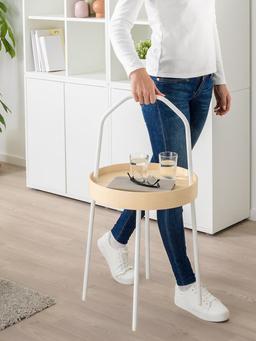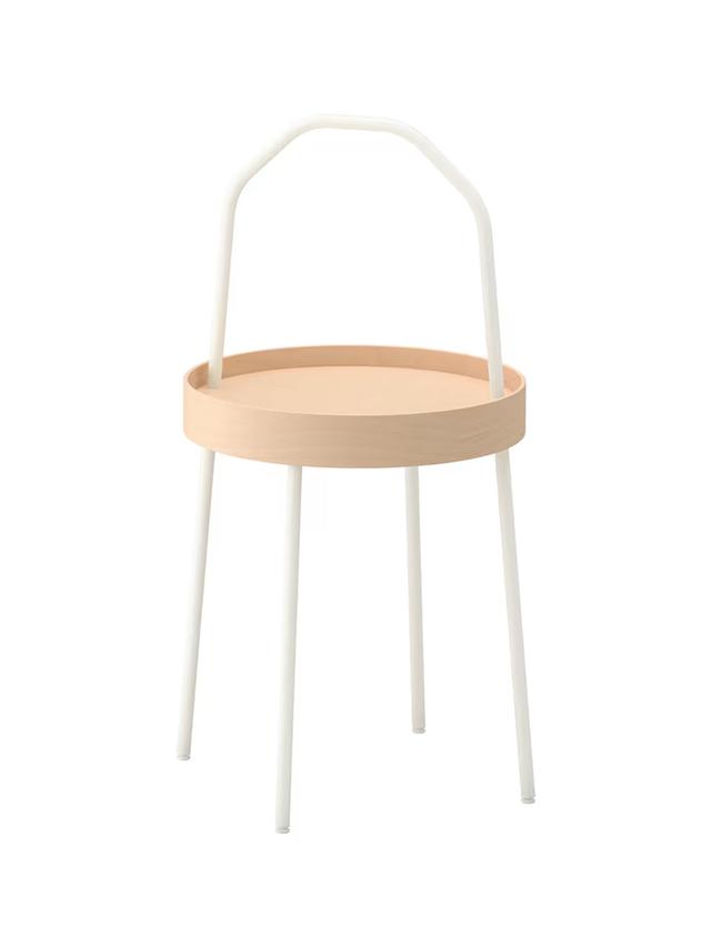 Gapdal-ýan stol, ak reňkde, diametri 38 sm. Ýeňil we götermäge amatly tutawaçly gurluşy bilen öýüň islendik ýerinde ulanmak üçin niýetlenen. Çeýe we häzirki zaman dizaýnly, kitap, çaý ýa-da bezeg zatlary goýmak üçin ideal.