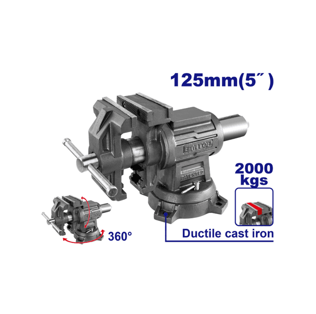 Emtop EBVE0501 slesar gysgyçlary, gysgyçlarynyň giňligi 5" (≈125 mm), 360° öwrülýän esasy, oturdylan sany we nurbatly gysyş mehanizmi bilen enjamlaşdyrylandyr. Berk guýma metalldan ýasalan, agramy — 19,5 kg, maksimal gysyş güýji — 2000 kgf, ussahananyň stoluna (werstaka) nurbatlar (boltlar) arkaly berkidilýär, ussahanalarda we önümçilikde ulanmak üçin niýetlenendir.