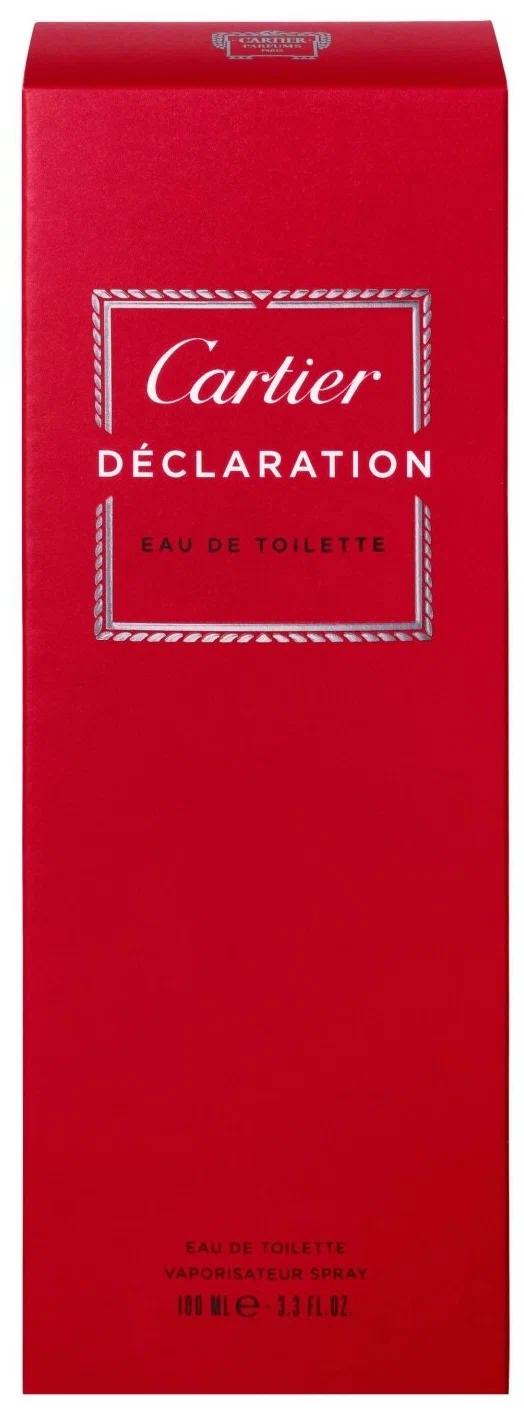 Cartier Déclaration (100 ml) taharet suwy — bu 1998-nji ýylda çykarylan nyşançaly, intellektual we çylşyrymly erkek atyrydyr. Ol agaçly ysmaly / sitrusly fužerli (Woody Spicy / Citrus Aromatic) toparyna degişlidir we meşhur atyrçy Žan-Klod Ellena tarapyndan döredildi. Atyr dogruçyllykdan, hyjuwdan we sözüň güýjünden ylham alýar — bu duýgularyň beýanydyr. Ol döwrebap, oýlanýan we nepis erkegi özünde jemleýär. Ýokarky notlar Ajy apelsin, Tüwi, Kardamon, Berýoza, Bergamot, Mandarin Ýalpyldawuk, ysmaly we ýiti başlangyç. Ajy apelsin we kardamon özboluşly, birneme metallik we arassa akkord döredýär. Orta notlar Iris, Zynjyr, Darçyn, Burç, Çaý, Ýasmin Howalylygy saklap, atyra çuňluk we ýylylyk berýän ýyly, ysmaly-gülli ýürek. Esasy notlar Wetiwer, Kedr, Deri, Dub mohy, Ambra Gury, nepis we agaçly-derili esas. Wetiwer we kedr durnukly, arassa we inçe yzy üpjün edýär. Umumy täsiri: Déclaration — bu kardamon-sitrusly, agaçly we örän arassa atyrdyr. Ol aşa ähliumumy, inçe we döwrebap atyrçylygyň şa eseridir hasaplanýar. Ýylyň islendik wagtynda ofisde ýa-da gündizki ulanmak üçin ideal.